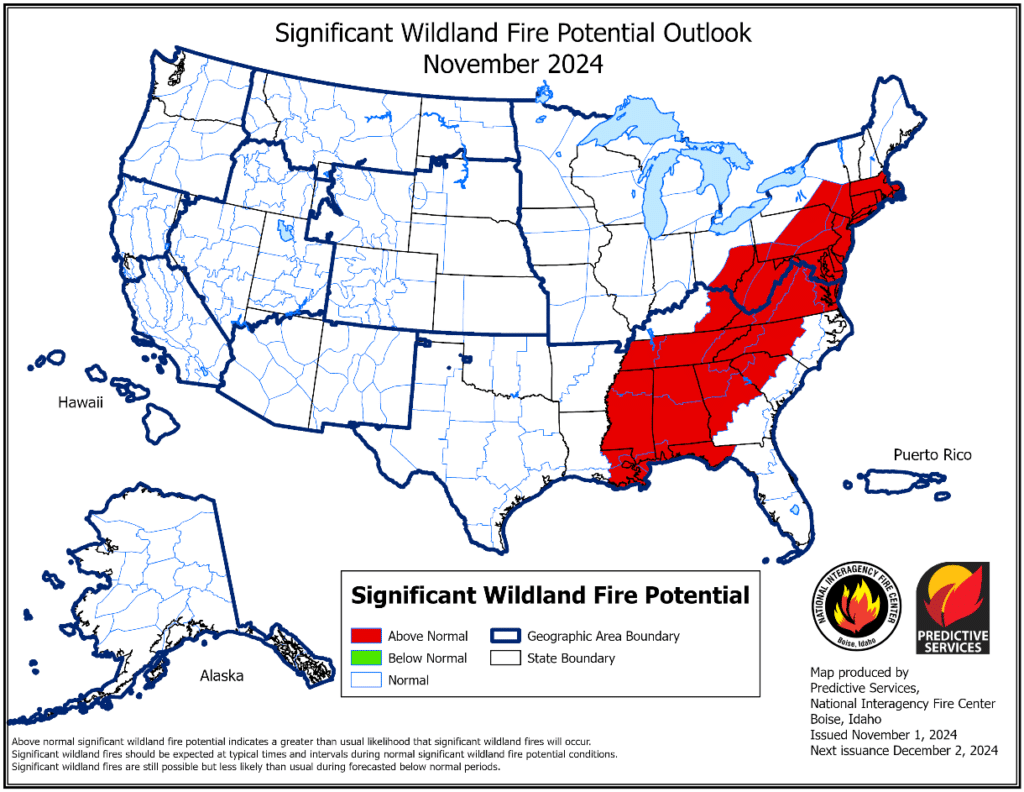 To demonstrate, the two maps below are from the National Interagency Fire Center and illustrate (1) the Wildland Fire Outlook for November 2024, which is concentrated in the South and Mid-Atlantic regions (not normally thought of as at-risk), and (2) the Current Wildfire Map as of November 11, 2024.