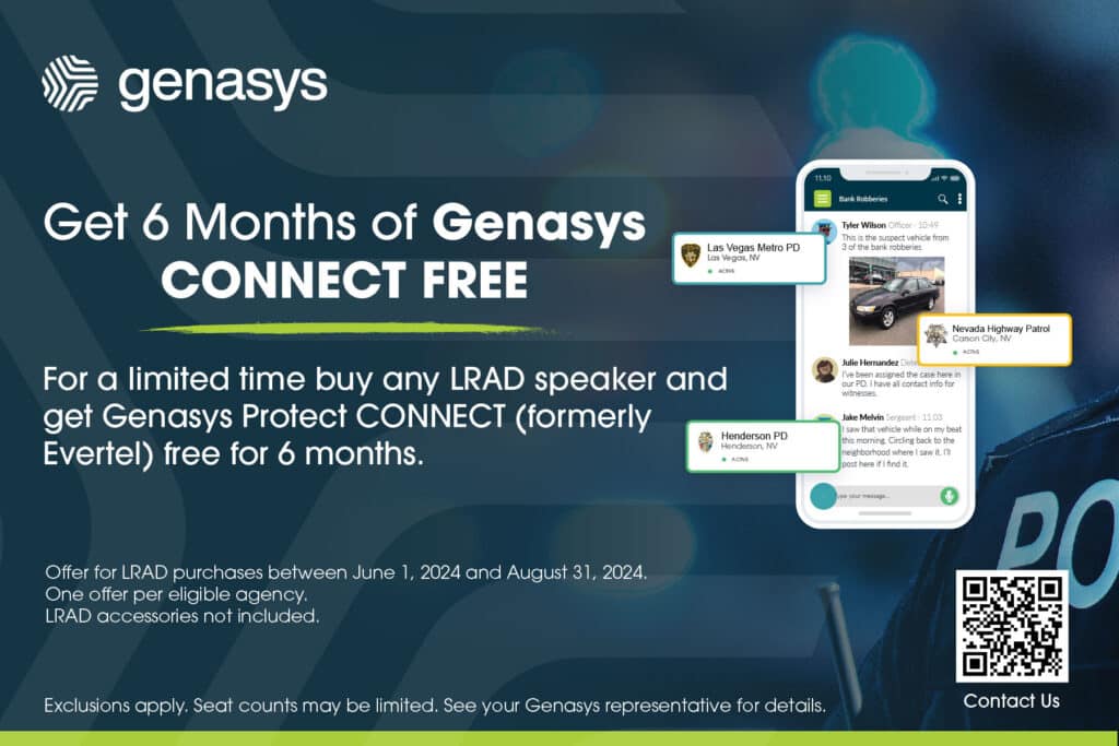 Contact Genasys to learn more about how LRAD voice broadcast systems and the CONNECT messaging app create a seamless emergency communications solution for your first responder team.